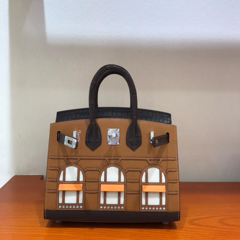 • With a magnificent display of artistry, the Day Hermès Faubourg Birkin depicts the storefront at 24 Rue du Faubourg Saint-Honoré in Paris as it is seen in daylight. The roof, rendered in Ébène Matte Alligator, contrasts beautifully with the walls of Gold Madame. The stonework is detailed in Brûlée Sombrero over a base of Ébène Sombrero. The arched glass windows are depicted in Craie Epsom.