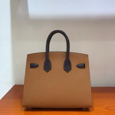With a magnificent display of artistry, the Day Hermès Faubourg Birkin depicts the storefront at 24 Rue du Faubourg Saint-Honoré in Paris as it is seen in daylight. The roof, rendered in Ébène Matte Alligator, contrasts beautifully with the walls of Gold Madame. The stonework is detailed in Brûlée Sombrero over a base of Ébène Sombrero. The arched glass windows are depicted in Craie Epsom.