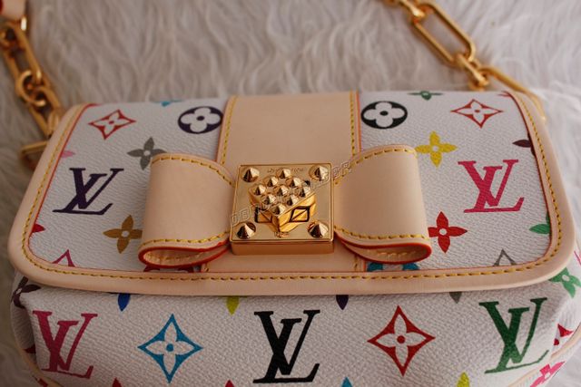 With chic bows and pleats and an array of vivid colours, the Patti is perfect for day or evening. Monogram Multicolore canvas and a studded gold brass twist lock make a feminine style statement.