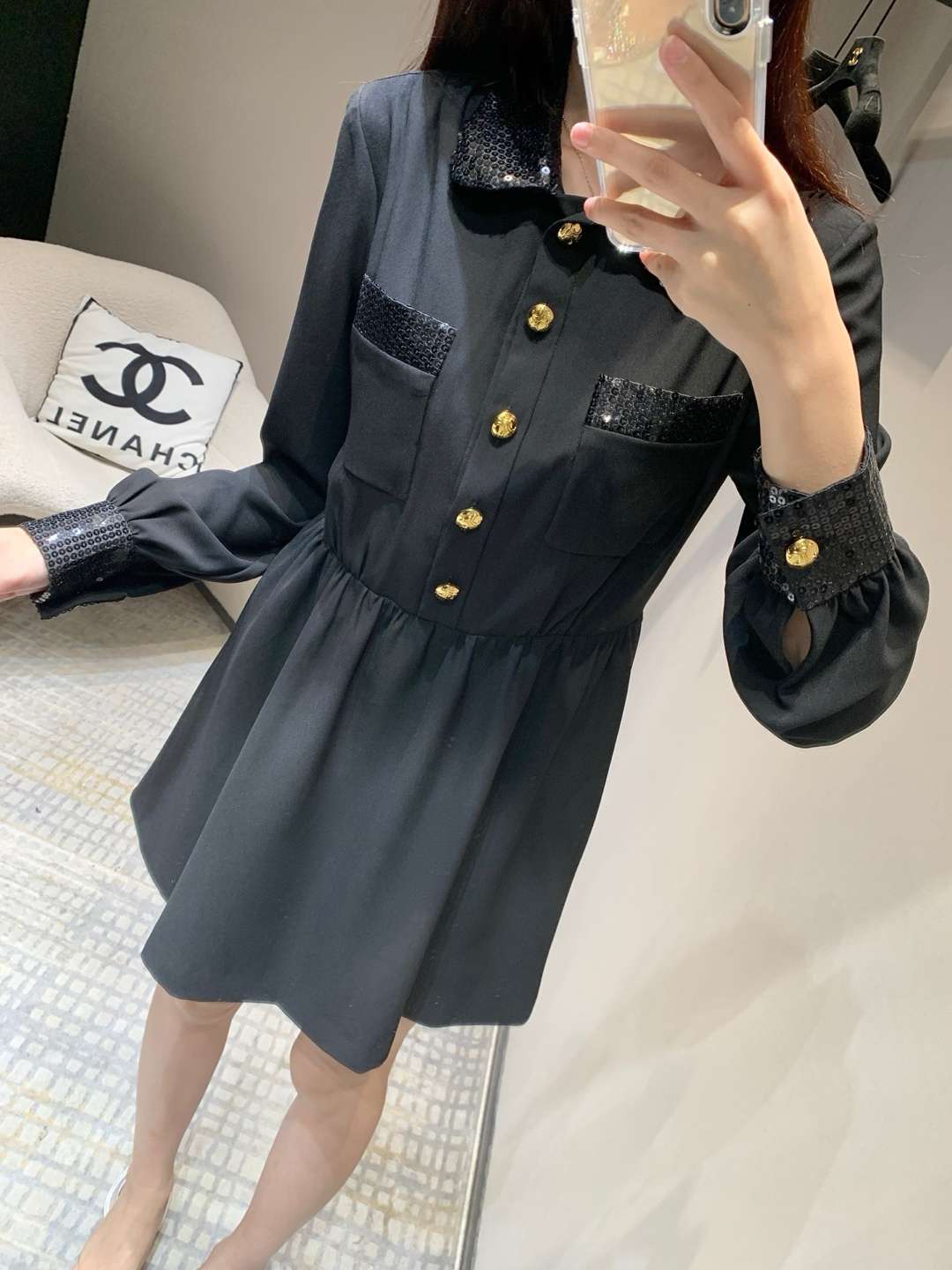 Celine 25SS Early Spring New Collection – Sequin Collared Dress, exclusively crafted in a high-end version! Handmade sequin-embroidered pleated waist dress, exuding elegant fashion. The sequin collar and cuffs are paired with decorative pocket edges, creating a harmonious and captivating look with stunning details. The golden Arc de Triomphe buttons add a signature brand touch. With a moderate length and pleated waist design, it perfectly blends sophistication and charm.